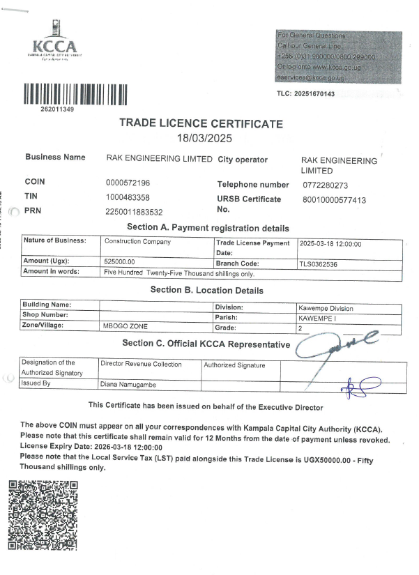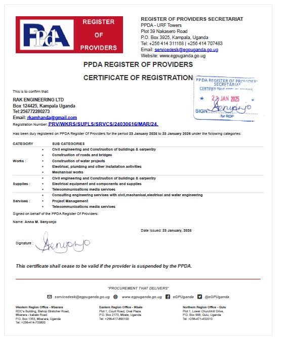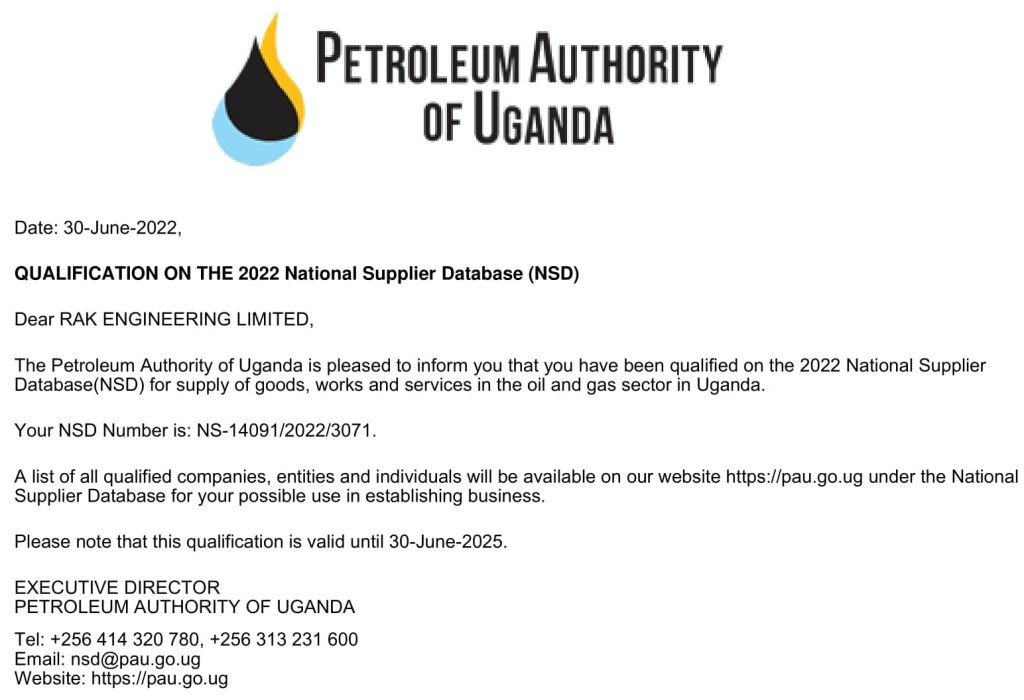 RAK ENGINEERING LTD is a duly incorporated company. We are also registered with Public Procurement and Disposal of Public Assets (PPDA) and Petroleum Authority of Uganda (PAU) as per the certifications below: